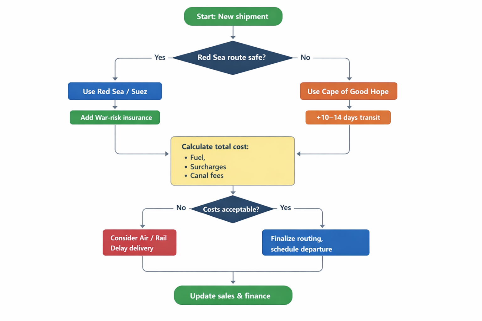 - Use Decision Flow: (See flowchart below.) If Red Sea unsafe, plan Cape. If Red Sea open, weigh war-risk + convoy costs vs 2 weeks saved.